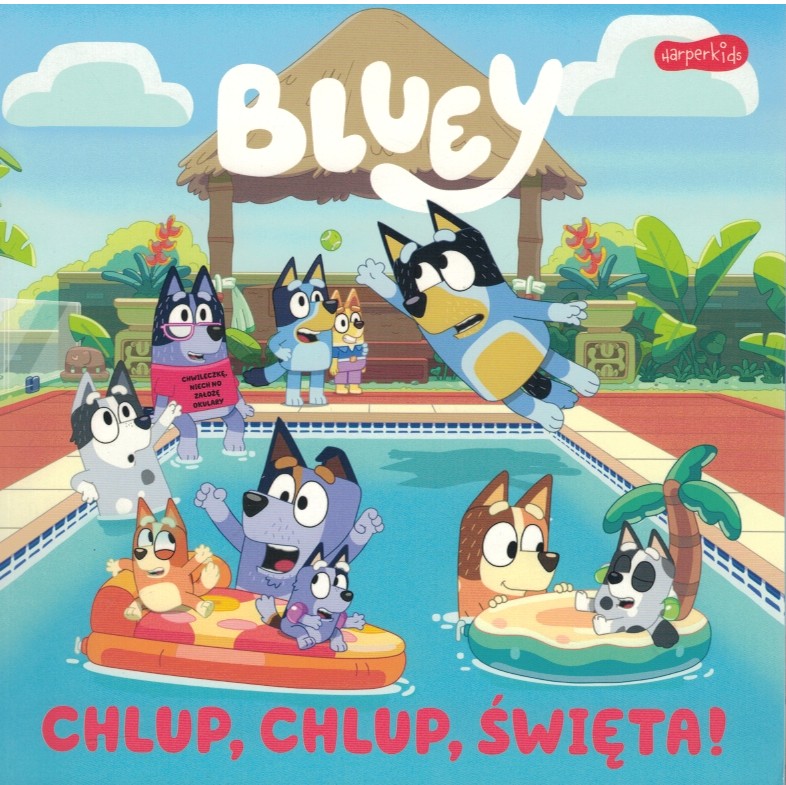 Rodzina Łączków spędza pierwszy dzień Świąt Bożego Narodzenia nad basenem w domu Muffinki i Stopki. Dla Bartolomea, czyli nowej zabawki Blue, to pierwsze święta w tym towarzystwie. Jak Bartolomeo odnajdzie się w nowej rodzinie? Czy przymusowa kąpiel w basenie, zabawa we Wskocz po Piłkę, lądowanie twarzą w talerzu z sosem i nieco zbyt intensywne wycieranie ręcznikiem mu nie zaszkodzą? Jakiej rady udzieli nowemu Ciocia Fryzia, która też niedawno dołączyła do rodziny? Ta pełna humoru opowieść została napisana na podstawie odcinka serialu Bluey, a ilustracje i dialogi zostały zaczerpnięte wprost z animacji. Opowiadanie dotyka motywów takich jak poznawanie nowych osób, oswajanie nieznanych sytuacji i życie rodzinne. W książce jest wszystko, co uwielbiają fani i fanki kreskówki w każdym wieku – wyjątkowy klimat, zabawne wyrażenia, codzienne życiowe prawdy, dużo pozytywnej energii i mądre, acz nienarzucające się przesłanie. Książeczka ma niewielki format i z łatwością zmieści się do torebki mamy, kieszeni taty albo do dziecięcego plecaka, dzięki czemu może towarzyszyć młodemu czytelnikowi w podróży, w poczekalni u lekarza albo podczas wycieczki. Dzięki dużym literom i prostym tekstom doskonale nadaje się do nauki czytania, a kolorowe ilustracje można oglądać nawet wtedy, gdy treść opowiadania zna się już na pamięć [opis wydawcy].